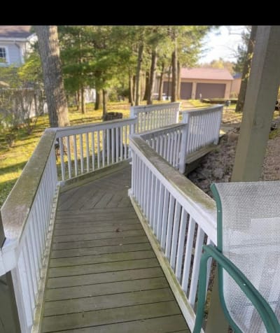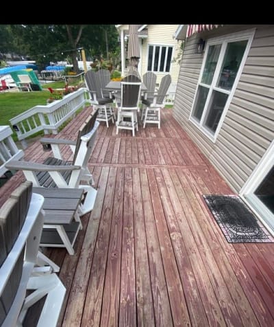 This lakefront dock and railing system was weathered and faded from years of sun and water exposure. Now it's protected with UV-resistant coatings designed for waterfront properties.